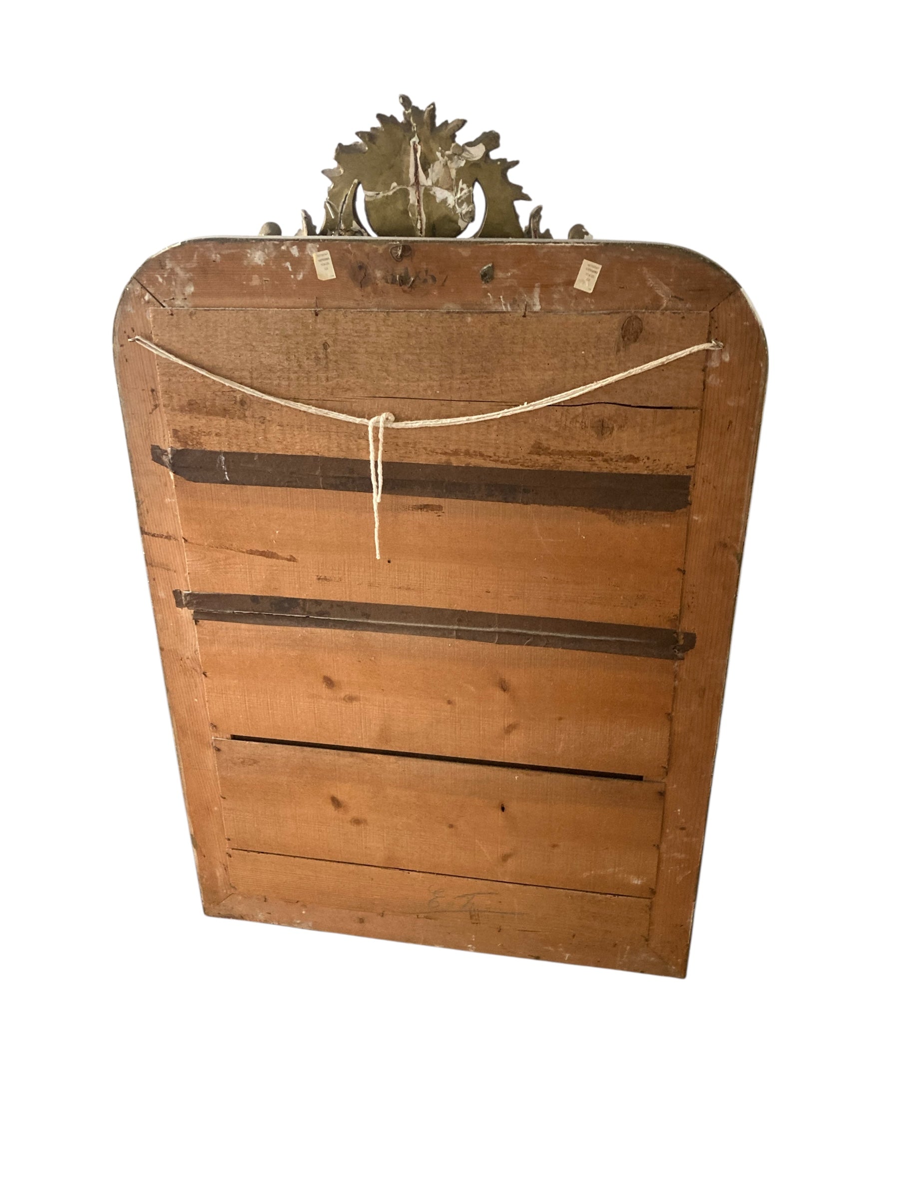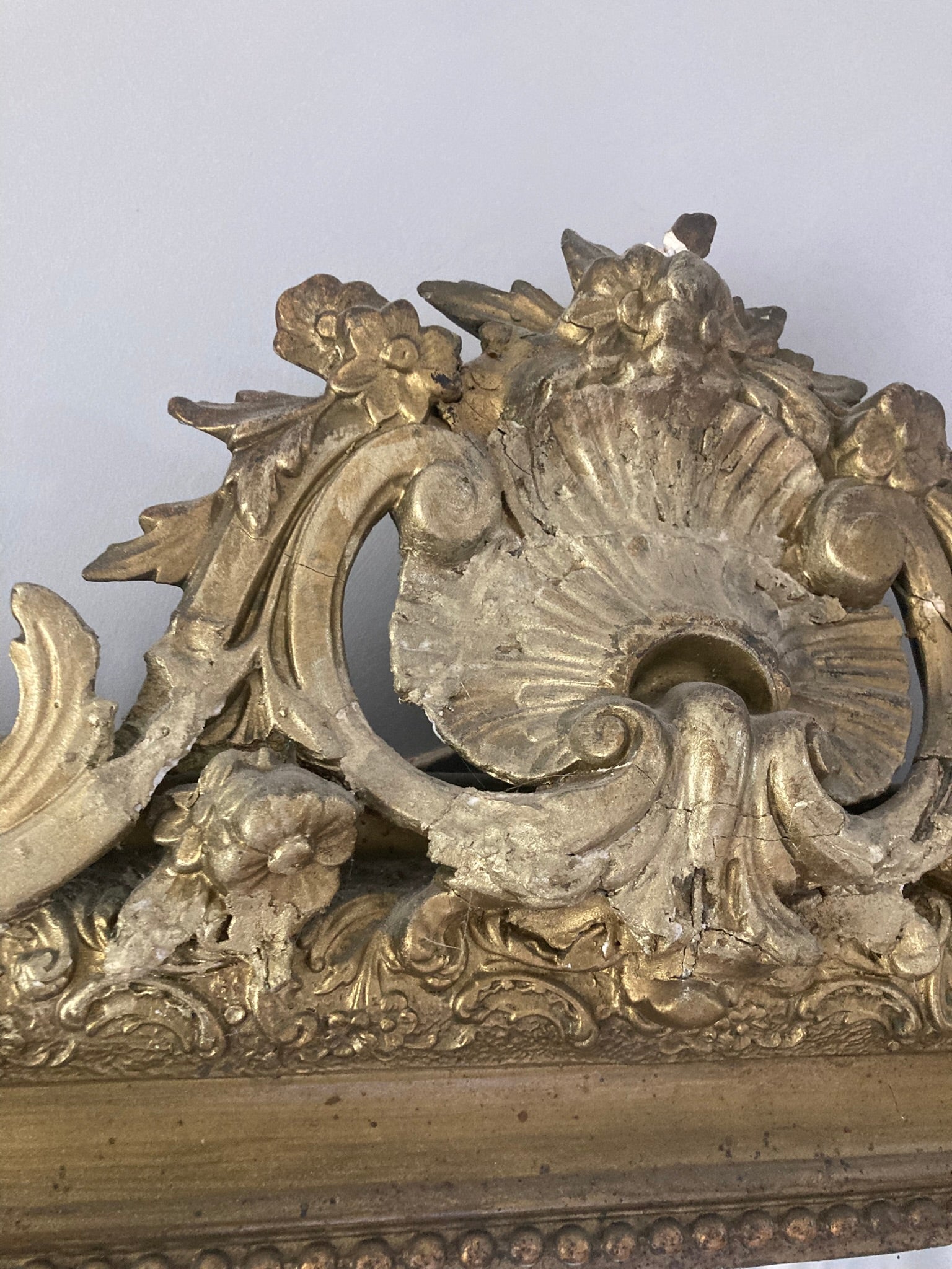Antique French Louis XV mirror dates from around 1880. It has its beautiful gesso frame including its ornate crest. It has its lovely original heavy glass with natural foxing and original pine backboards. It would make a beautiful mirror above a console in a hall or used as an overmantel.