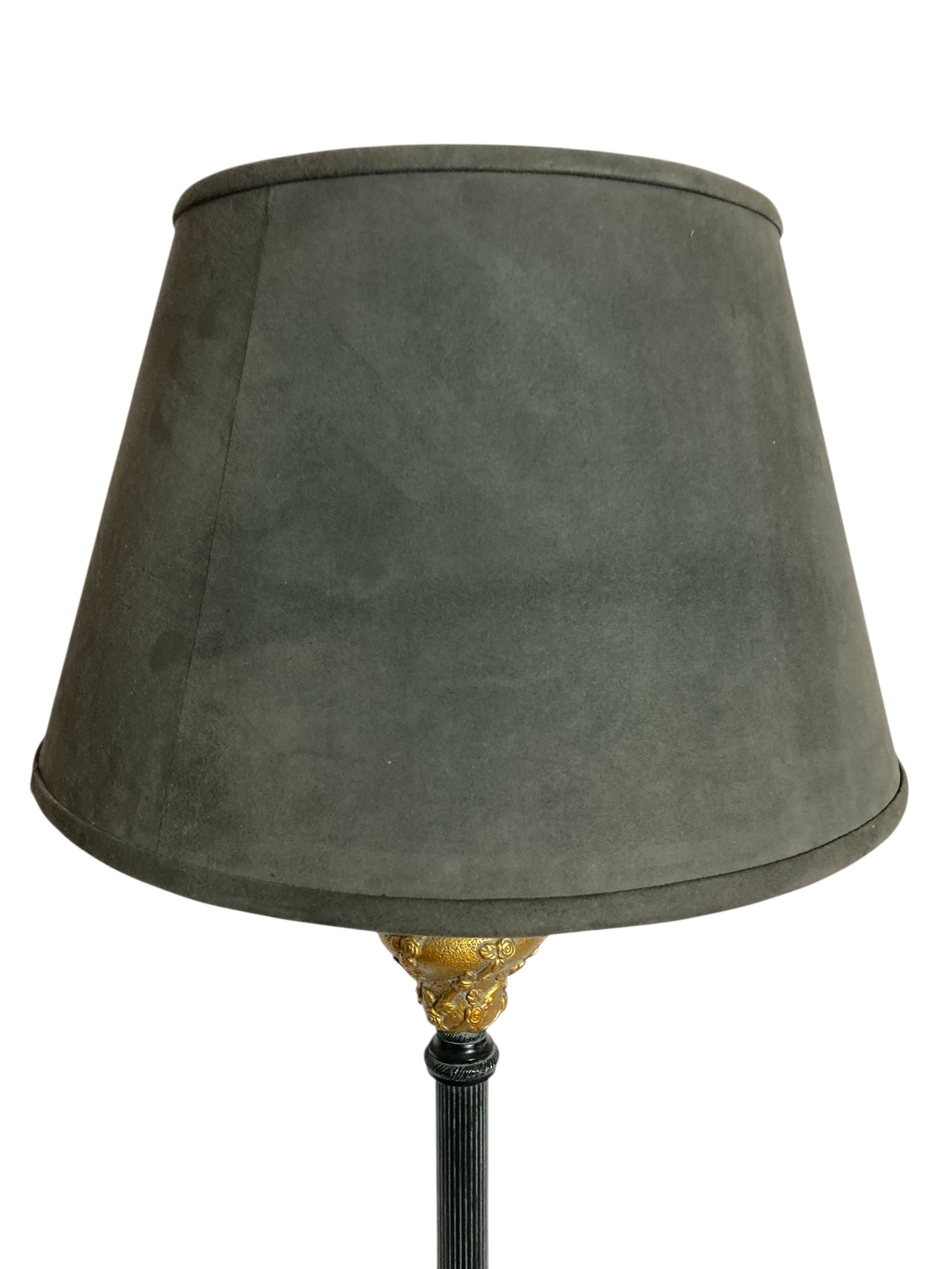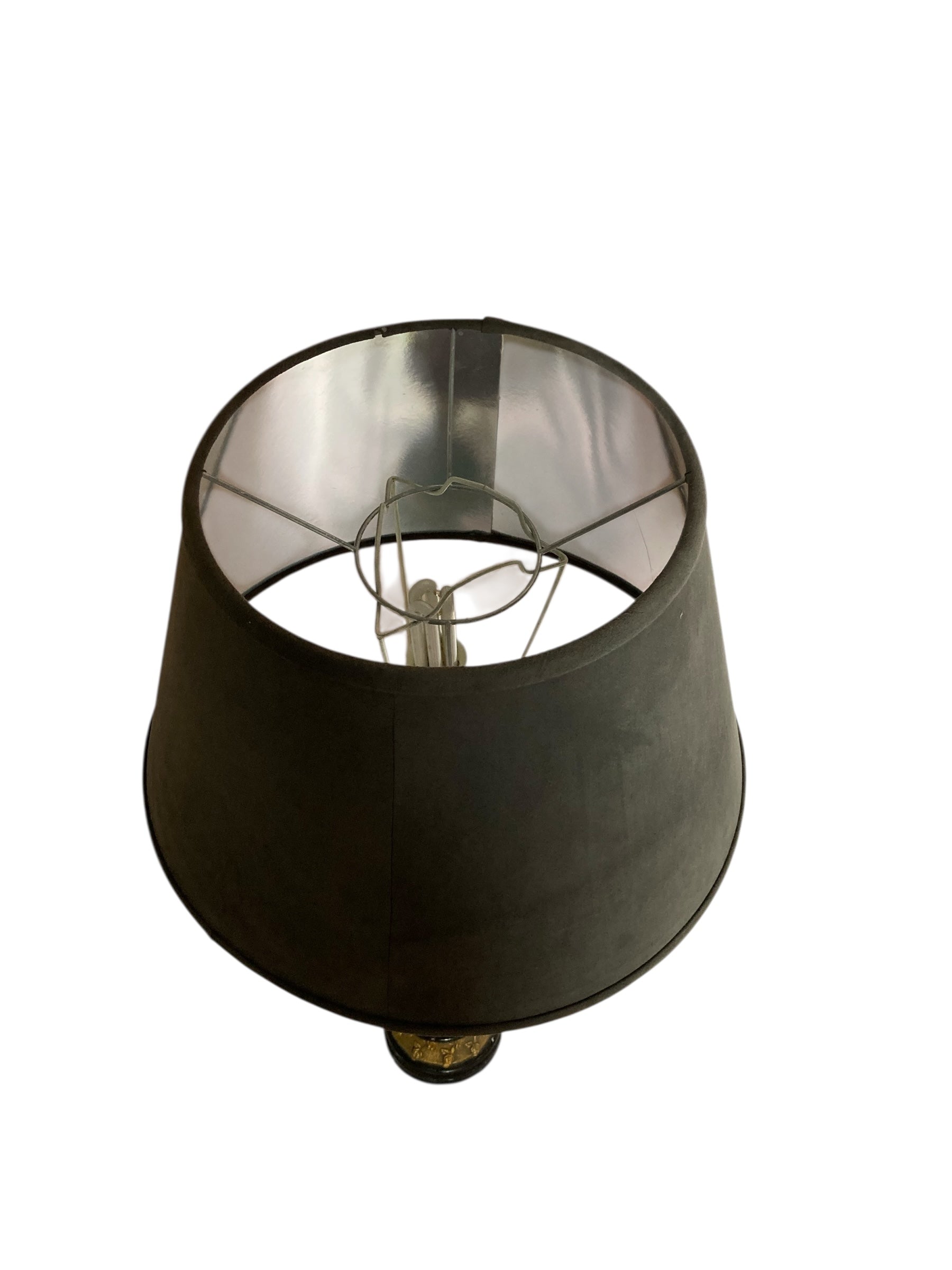Black and Gold Corinthian Style Table Lamp Grey Velvet Shade with Rose floral decor