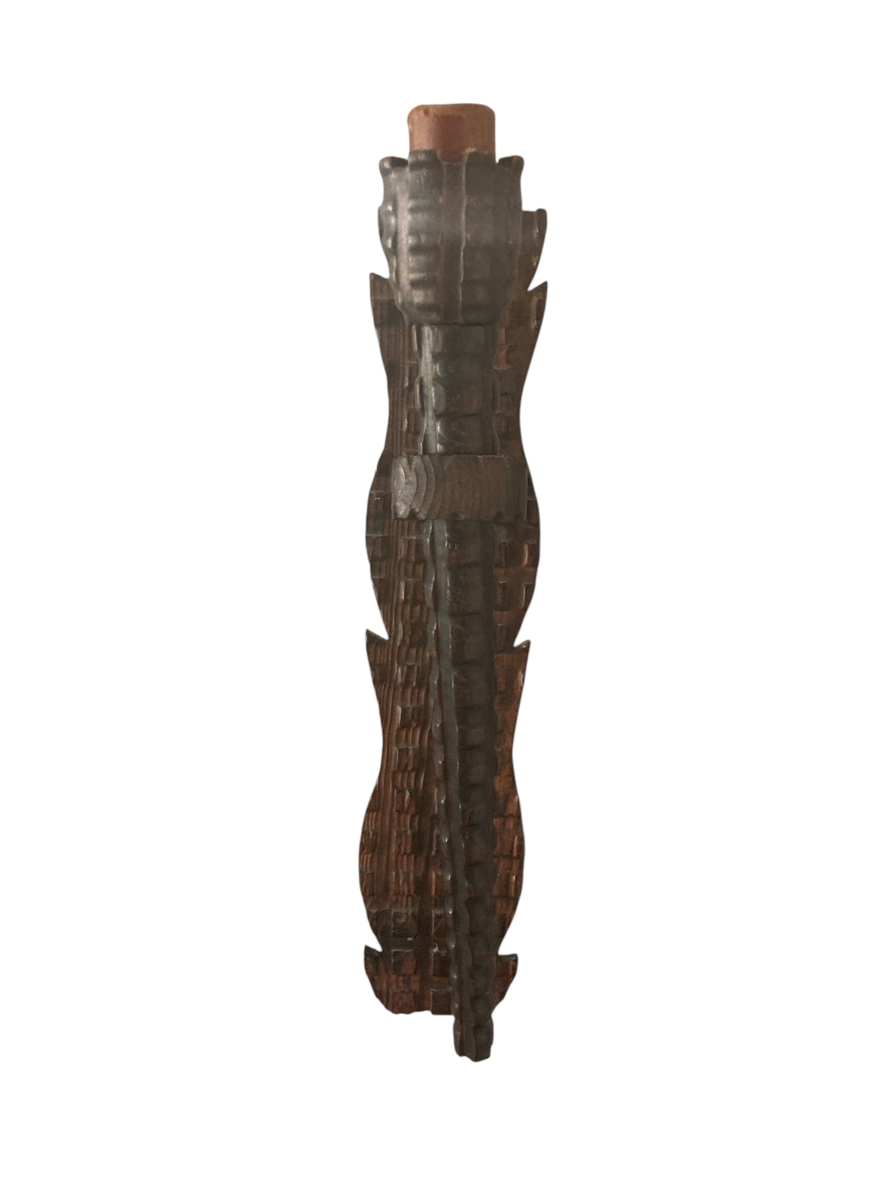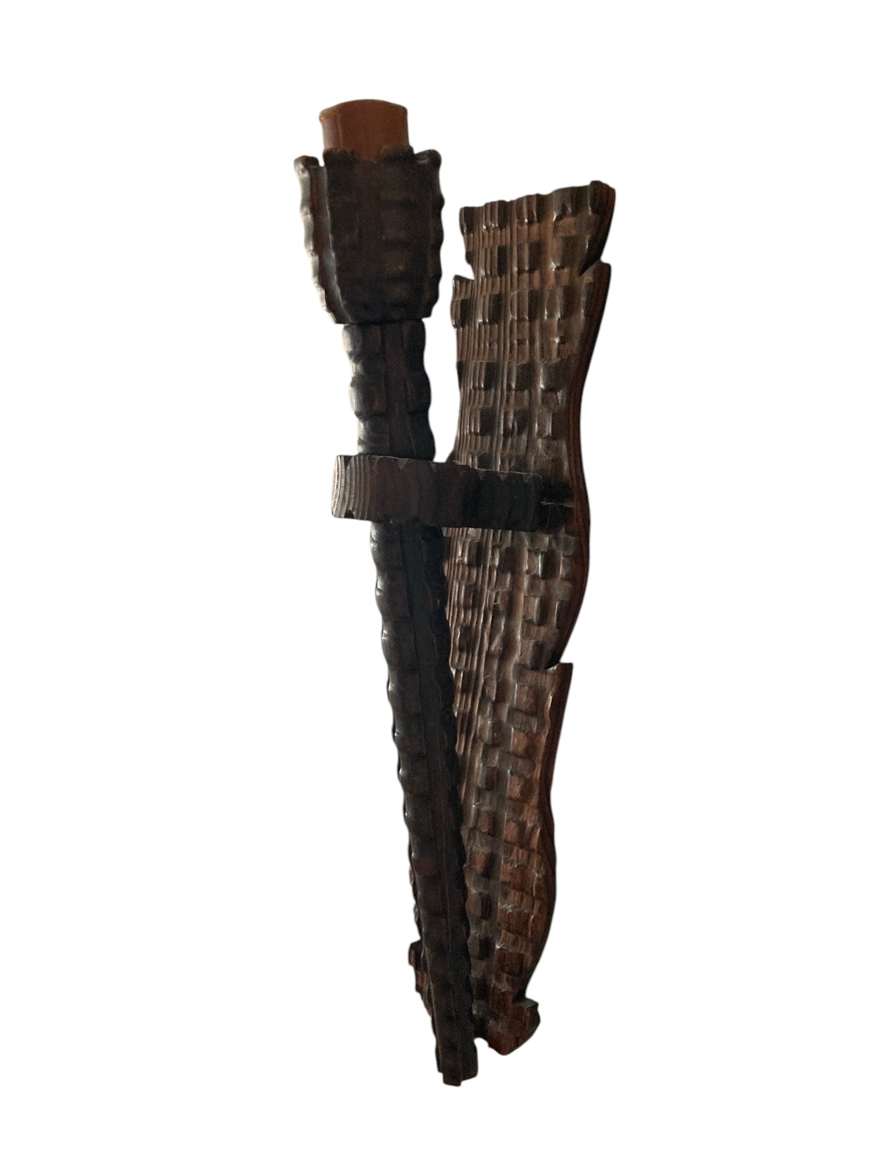 Neo Gothic Medieval Style Carved Wood Wall Candle Holder or Torchere. This imposing wooden candle holder seamlessly combines natural beauty with functionality, featuring a sturdy design that complements any decor. The holder cradles a classic candle, casting a warm and inviting glow, while the backdrop of a wooden wall enhances its rustic charm. Ideal for creating a cozy atmosphere in living spaces, this piece serves as both a decorative accent and a source of soft illumination.