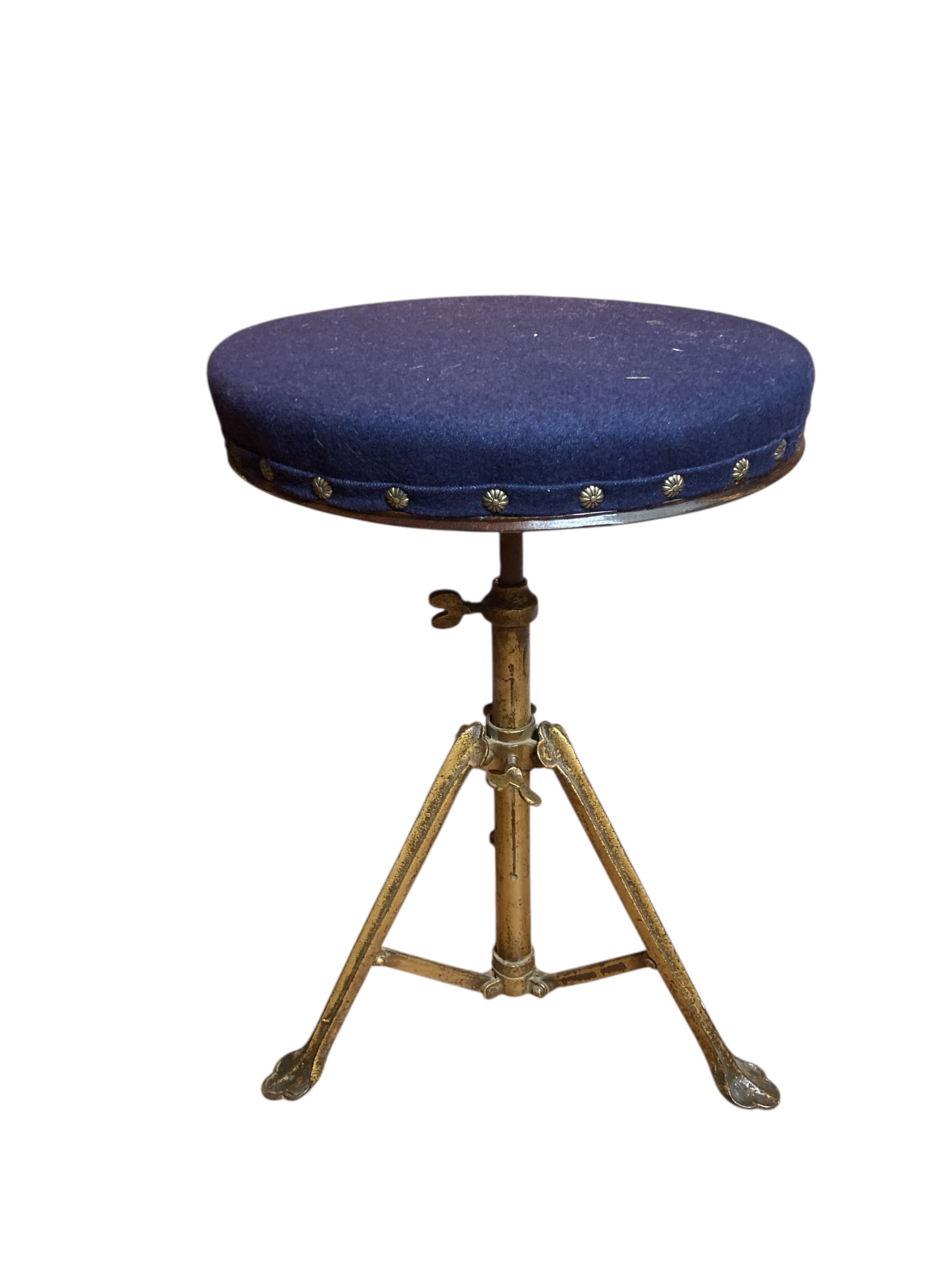 Vintage Brass Extendable Piano or drum stool designed to blend modern elegance with industrial charm. The striking blue upholstery offers a vibrant pop of color, while the brass accents add a touch of sophistication. Crafted with a sturdy metal base, this stool ensures durability and stability, making it perfect for both casual seating and stylish decor. Whether placed in your living room, kitchen, or home office, this versatile piece is sure to enhance any interior while providing comfort and style.